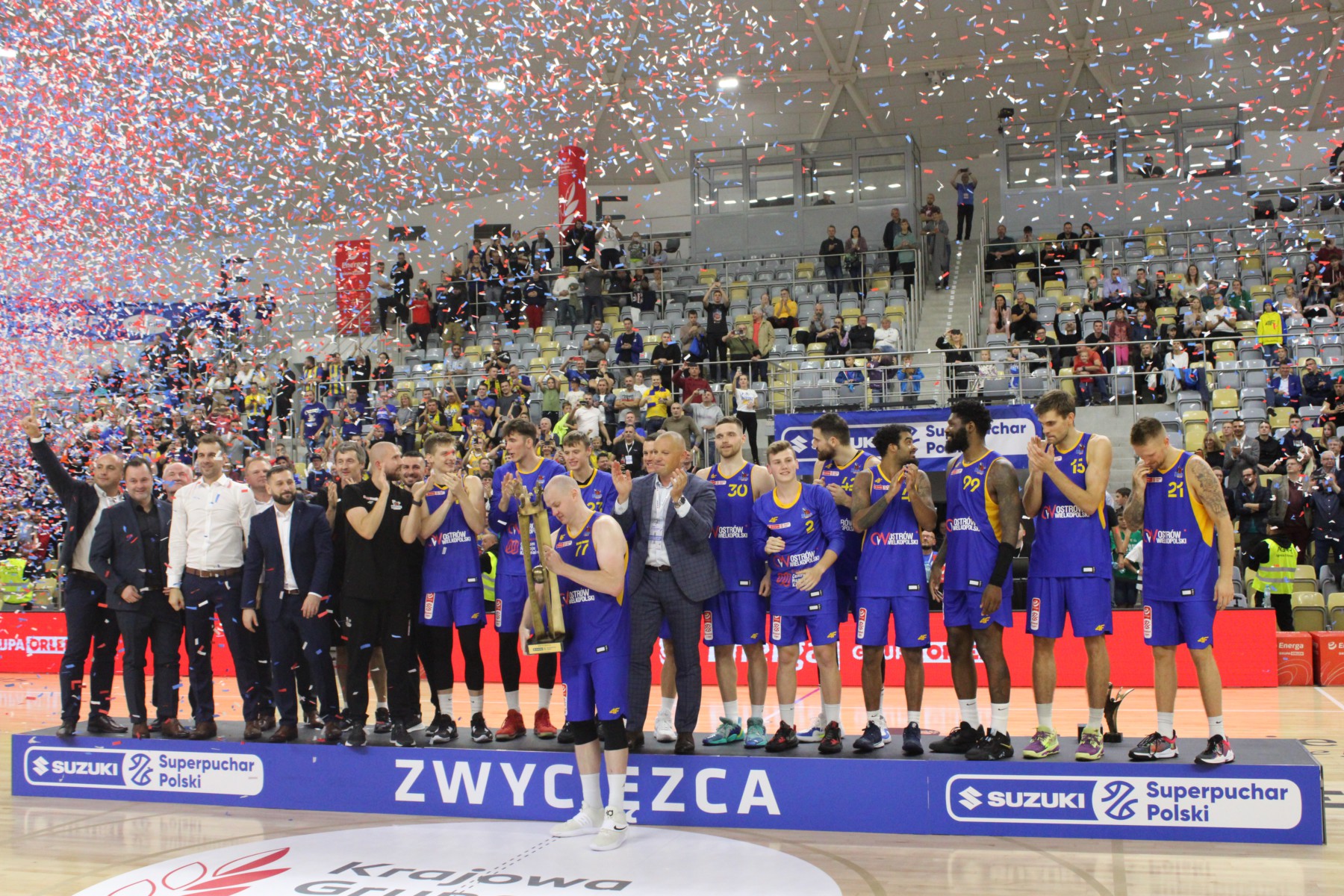 Piękny moment w Stegu Arenie w Opolu dla koszykarskiego Ostrowa. Damian Kulig, kapitan BM Stali uniósł w górę piękne trofeum – Puchar im. Adama Wójcika za zwycięstwo w Suzuki Superpucharze Polski. Ostrowski zespół ograł w nim Śląsk Wrocław 94:81, a MVP Superpucharu został Damian Kulig.