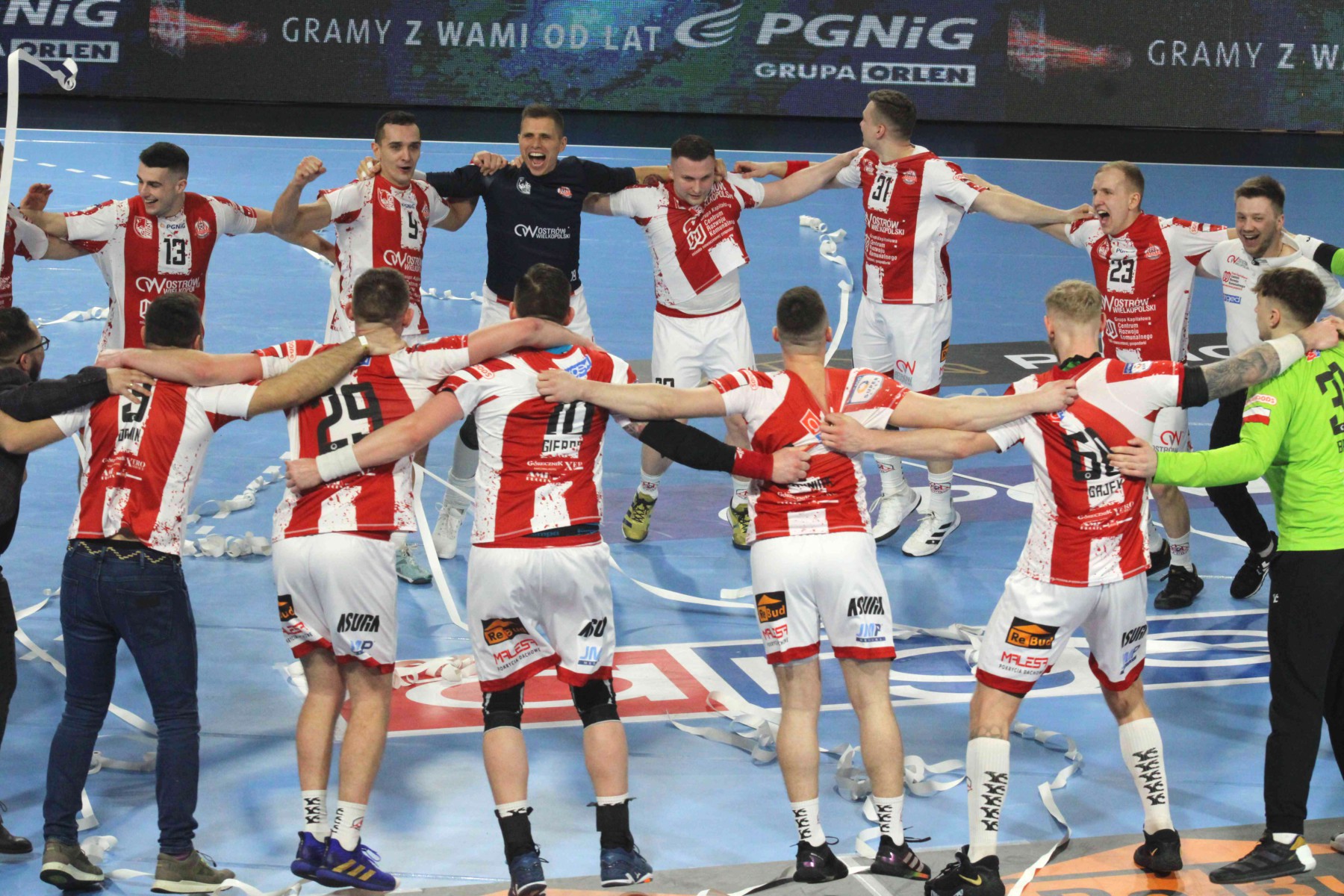 Arged KPR Ostrovia wygrała dziewiąty mecz w sezonie i awansowała na siódme miejsce w tabeli PGNiG Superligi. Nie dziwi zatem szalona radość zawodników, trenerów i zarządu oraz wspaniałej atmosfery na trybunach Areny Ostrów, gdzie kolejny raz zasiadł komplet publiczności.