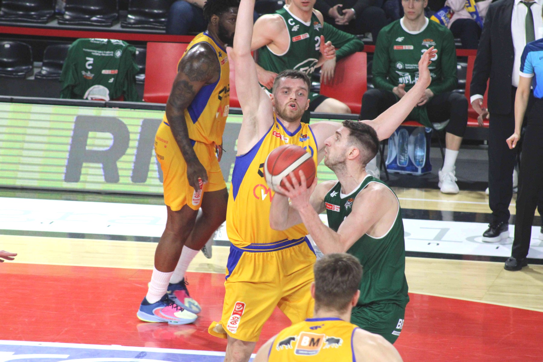 W 11 minucie po trójce Nemanji Djurisicia Stal wygrywała 37:23. Nieco ponad 2 minuty później było już tylko 39:24, po tym jak piąty raz z dystansu celnie trafił Bryce Alford, który miał w tym momencie na koncie już 17 punktów. Szaleństwo rzutowe trwało w najlepsze. Żołnierewicz zmniejszył w 14 minucie straty swojej drużyny do czterech punktów, a po trójce Adonisa Thomasa Stal ponownie prowadziła dziesięcioma „oczkami”.