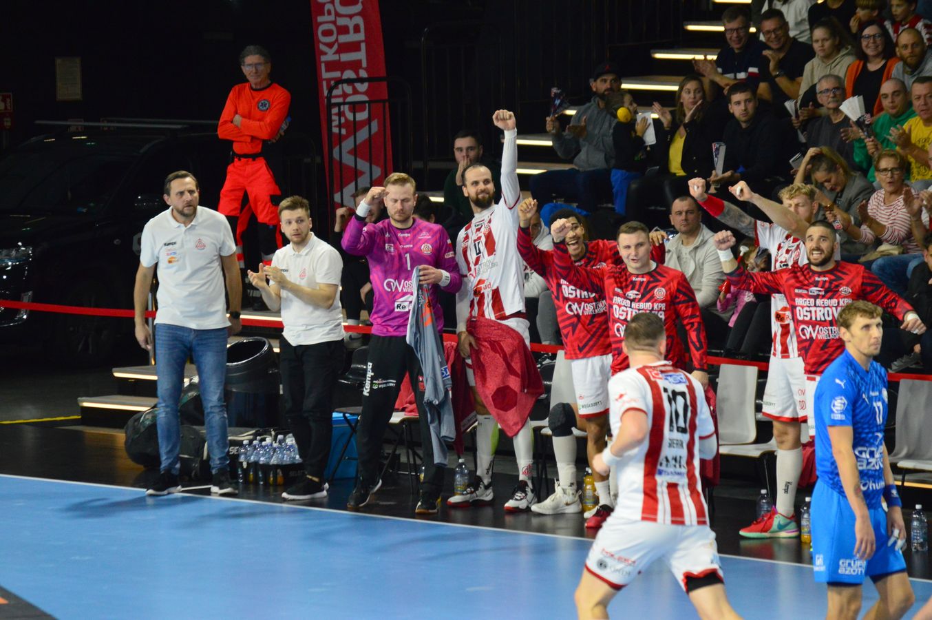 W pierwszej połowie żadna z drużyn bardzo długo nie była w stanie odskoczyć rywalowi. W mecz świetnie wszedł Marek Szpera, który zaliczył pierwsze cztery trafienia dla Arged Rebud KPR Ostrovii. Po około 20 minutach gry na tablicy widniał wynik 7:7.
