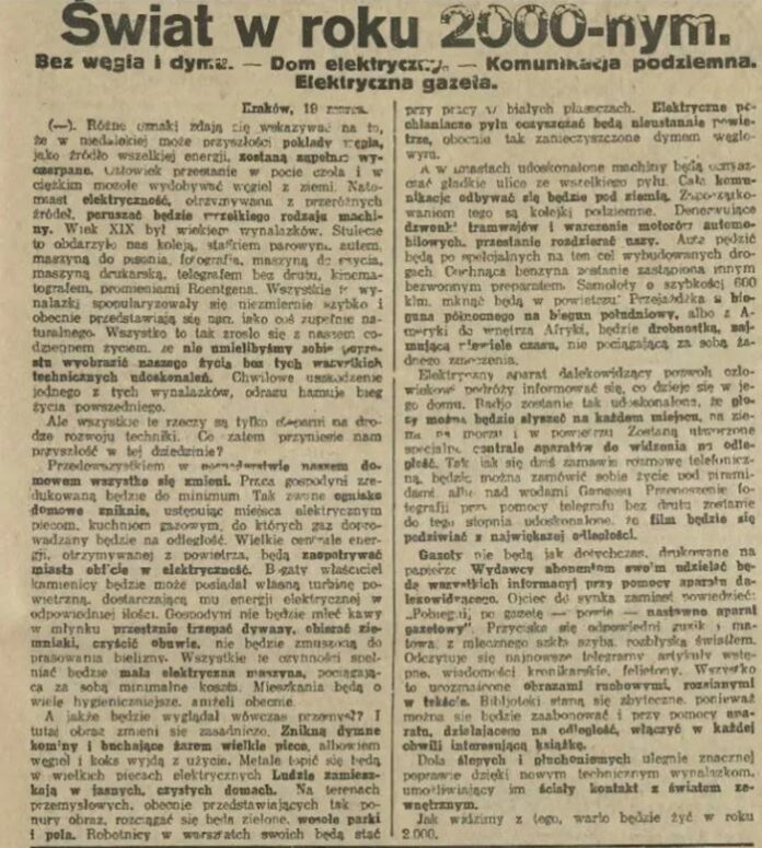 W Krakowie 19 marca 1926 r. anonimowy autor na łamach „Ilustrowanego Kuryera Codziennego” (IKC, zwany w skrócie Ikacem), przedstawił czytelnikom wizję przyszłości, w której przewidział niektóre wydarzenia i zjawiska, które dziś stały się albo stają się rzeczywistością. Nie wiadomo jak czytelnicy przyjęli prognozy krakowskiego wizjonera. Trudno jednak nie uznać, po dokładnie 100 latach, że kilka spostrzeżeń zawartych w artykule popularnego Ikaca zaskakuje a autora-wizjonera można przy okazji uznać za protoplastę ideologii klimatyzmu, tak dzisiaj forsowanej przez globalistyczne elity z Brukseli, zaprowadzające w Europie z obłędem w oczach tzw. zielony ład i walczące ze śladem węglowym.