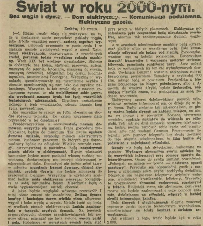 Natomiast trzeba przyznać naszemu jasnowidzowi, że jego przepowiednie dotyczące wykorzystania elektryczności zmaterializowały się dzisiaj w formie i treści w stosunku prawie jak jeden do jeden. Elektryczność to potęga współczesnego świata. Oto wizja krakowskiego wizjonera sprzed 100 lat: „Tak zwane ognisko domowe zniknie, ustępując miejsca elektrycznym piecom, kuchniom gazowym, do których gaz doprowadzany będzie na odległość. Wielkie centrale energii otrzymywanej z powietrza, będą zaopatrywać miasta obficie w elektryczność. Bogaty właściciel kamienicy będzie może posiadał własną turbinę powietrzną, dostarczającą mu energii elektrycznej w odpowiedniej ilości”. Prawda, że widać w tej wizji i wiatraki „do mielenia ptaków” i nieszczęsne pompy ciepła zespolone z panelami fotowoltaicznymi na dachach domów i z magazynami energii a także samochody elektryczne, bo jasnowidz stwierdził, że wszystkie czynności domowe będą wykonywały „małe elektryczne maszyny”. Od takiej maszyny do „elektryka” na drogach już bardzo blisko, zwłaszcza, że autor wieszczył wyeliminowanie benzyny z użycia vide zdanie: „Cuchnąca benzyna zostanie zastąpiona innym bezwonnym preparatem” a „(…) warczenie motorów automobilowych, przestanie rozdzierać uszy”. Co prawda, to prawda. „elektryk” sunie po drodze bezszelestnie!
